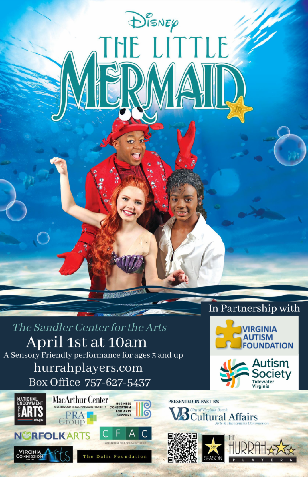 Autism Acceptance Month kicks off on April 1st and the Autism Society Tidewater Virginia (ASTV) and the Virginia Autism Foundation are pleased to partner with the Hurrah Players for a Sensory Friendly showing of Disney’s The Little Mermaid at 10:00 AM at the Sandler Center in Virginia Beach. We are excited to be able to serve those with different sensory processing needs as a certified sensory-inclusive organization through KultureCity(c) since 2019. A sensory-friendly performance is a theater production that welcomes individuals with sensory needs, including people on the autism spectrum, as well as first-time theatergoers. The show is modified to allow for patron movement, staff and actors are trained to accommodate patron needs, and all patrons are welcome to experience theater in a safe, non-judgmental environment.